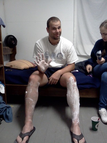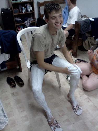 Po Visiting day, kdy se prijede tisicovka rodicu podivat na sve deti jak se jim u nas v kempu dari, se kazdorocne porada jakasi Miss pro muze, v nasem holcicim kempu je zastupcu muzskeho pohlavi pramalo, takze se souteze ucasti vsichni tenisovi instruktori a tri vybrani clenove naseho kitchen staffu. Letos padla volba na Gabora z Madarska, Davida z polska a take reporezentanta nasi maticky vlasti Mazyho. Kazdy z chlapcu je pred soutezi odvlecen do jednoho z bunku, kde ho patnactilete holcicky premalujou na holku, oblecou do vseho mozneho co v kempu najdou a poslou na molo, zde kazdy soutezici musi odpovedet na dve otazky ve styly jak byste zachranili svet pred jadernou valkou ap. Pote porota slozena ze zaslouzilych kemperek vybere ctverici nejlepsich a nejkrasnejsich babochlapu, kteri maji jeste jednu otaku k zodpovezeni a pak se vybere vitez. Nas polsky David se sice probojoval kvalifikaci az do finale, ale tam dosahl jen na bramborovou, takze kitchen staff zustal nakonec bez placky. Na obrazku je zachyceno povinne holeni nohou soutezicich, ktere diky mnozstvi chlupu na nohou dotycnych trvalo neco kolem hodiny, bylo zniceno nekolik holicich strojku a byly chlupama ucpany dva odpady nez nas napadlo splachovat je do zachodu. Enjoy…
