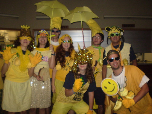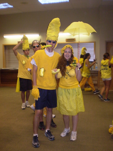 Crazy banana night se porada jednou za leto, v nahodne vybrany den a je to planovano jako velike prekvapeni pro deti, jelikoz se ale drby siri kempem velice rychle, vschni uz davno pred zacatkem vi co se bude dit. Vecer probiha tak, ze se detem nakuka, aby prisly vecer do jidelny, kde se bude konat obycejna a bezna ice-cream night. Kdyz se vsichni usadi, misto zmrzliny z dveri kuchyne vybehnout vsichni lide, kteri v kempu uz aspon jedno leto odslouzili, prevleceni do silenych bananovych prevleku. Pan sef se postavi na vyvysene mistecko, povi pohadku o zrozeni bananu ponoreneho do cokolady a nasledne se vsem banan ponoreny do cokolady rozda, zbasti se a de se zase domu. Ja jsem jako svuj kostym zvolil zluty pullover s dvema velkyma bananovyma prsama ktere mi klimbaly az u pasu, stylovou cepici ve tvaru bananu, protoze venku je asi jenom 40 stupnu tak i fancy rukavice a jako doplnek snorchl a plavecke bryle. Stal se ze me tedy underwaser banana. Na obrazku snad rozpoznate. Jedina vec ktere jsem na svem outfitu pozdeji litoval byly jiz zminene plavecke bryle, ktere byly zaprasene takovym zpusobem, ze pres ne neslo nic videt a chodit po jidelne s velkym tacem plnym bananu jen po cuchu a pritom se vyhybam malym soldum nebylo zrovna dvakrat idealni.